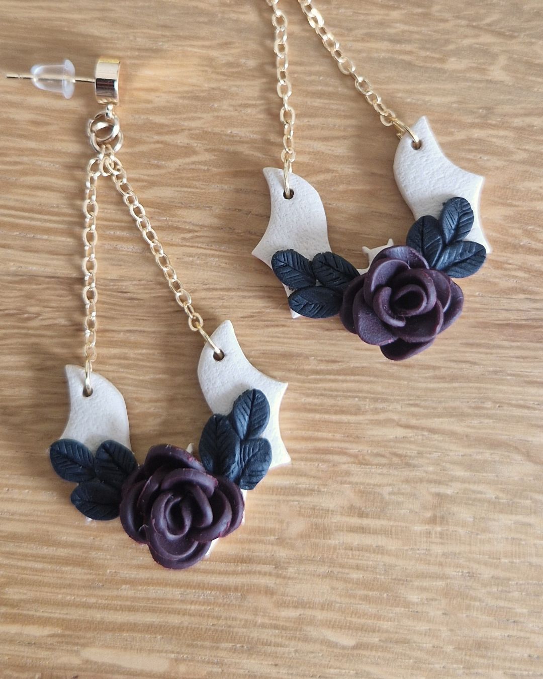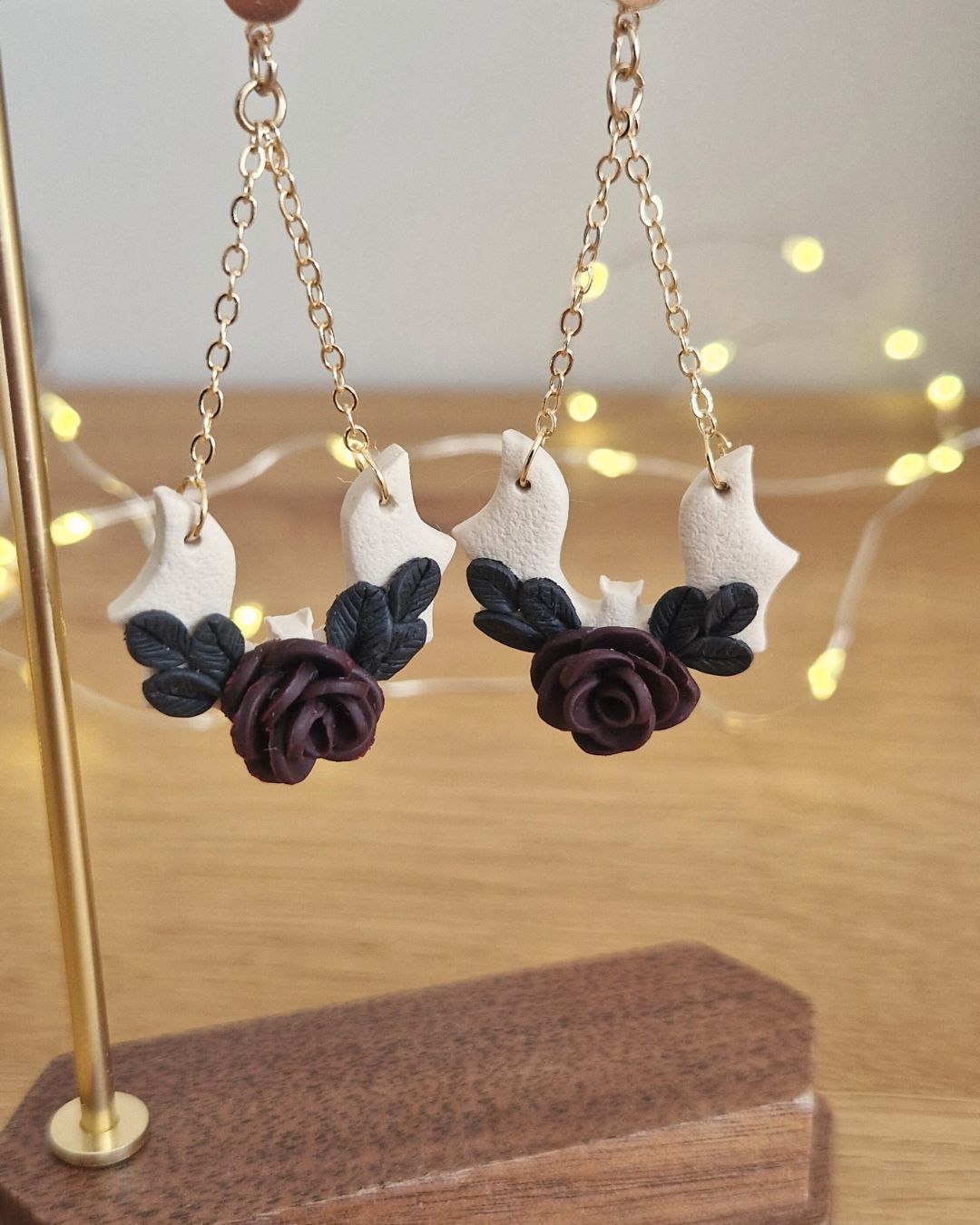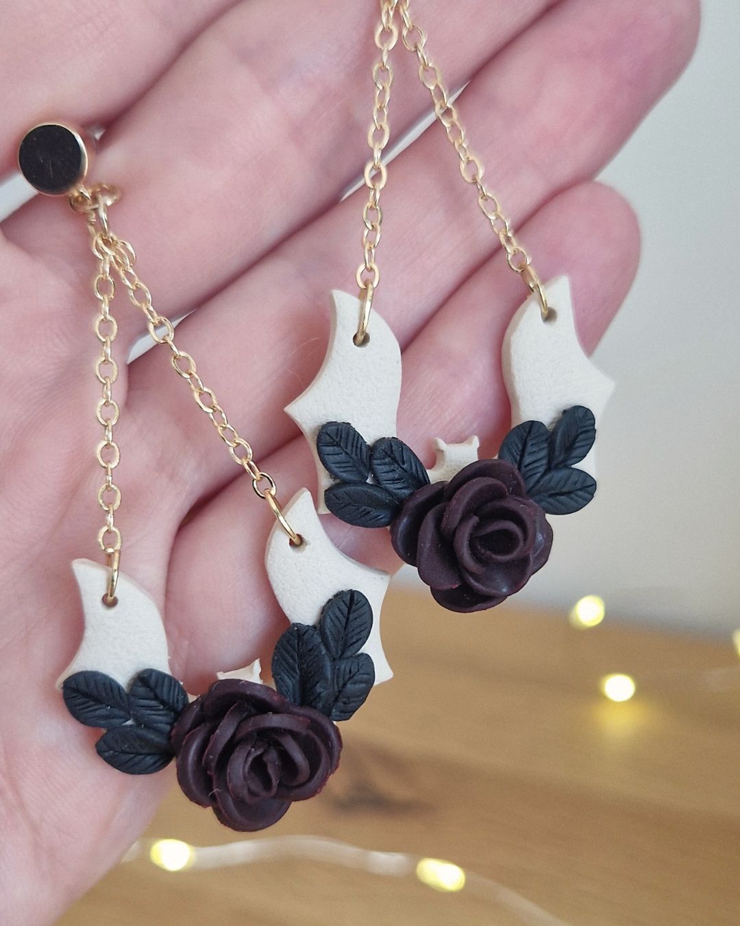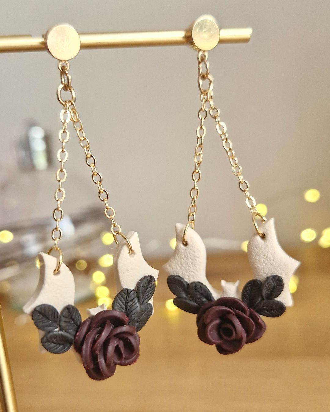 Ces boucles d’oreilles supendues associent la douceur du blanc cassé à la profondeur d’une rose prune foncé sculptée en relief, entourée de fins feuillages noirs. Les chauves-souris, se balancent au bout de chaînettes dorées pour offrir un mouvement élégant, mystérieux et infiniment poétique.