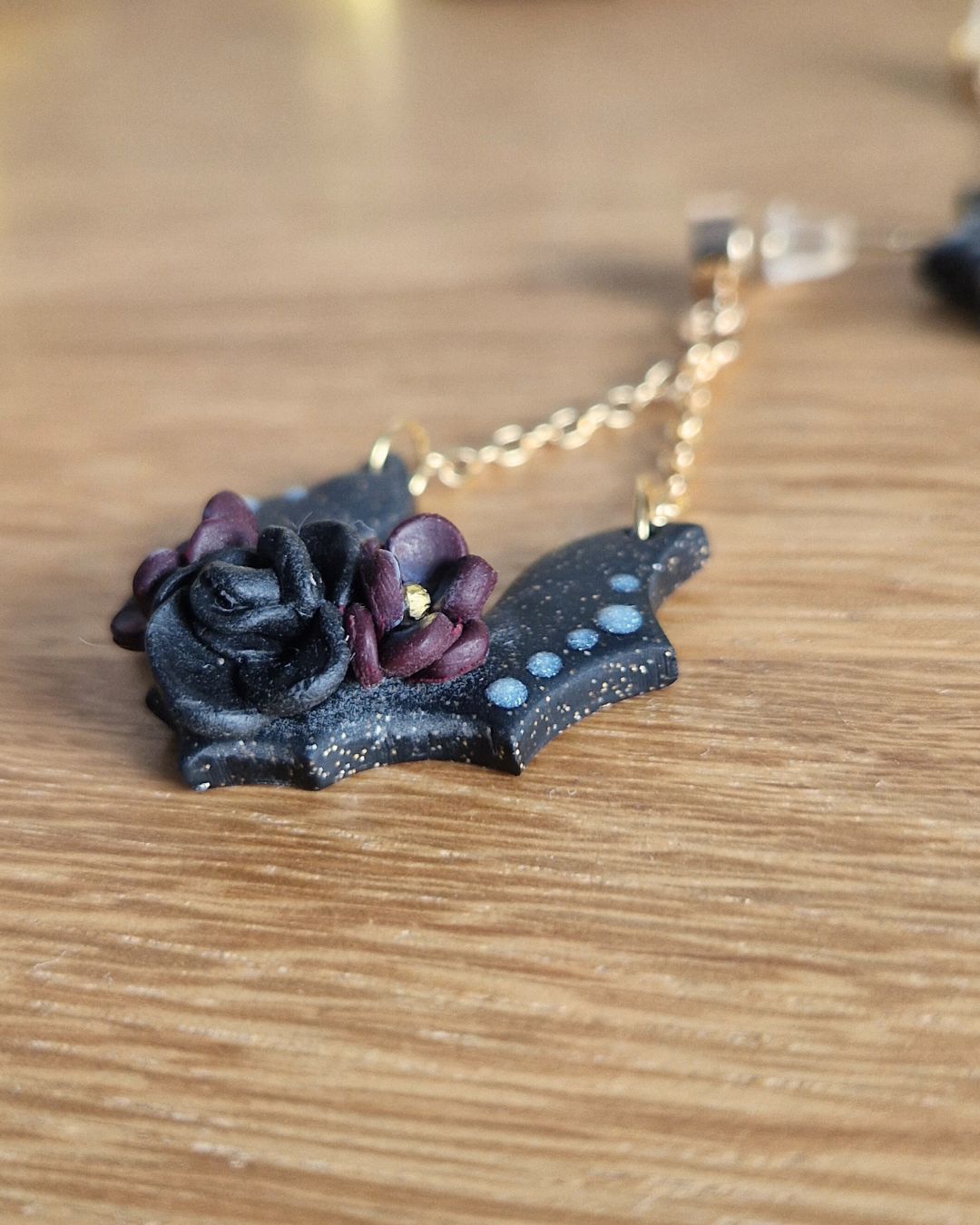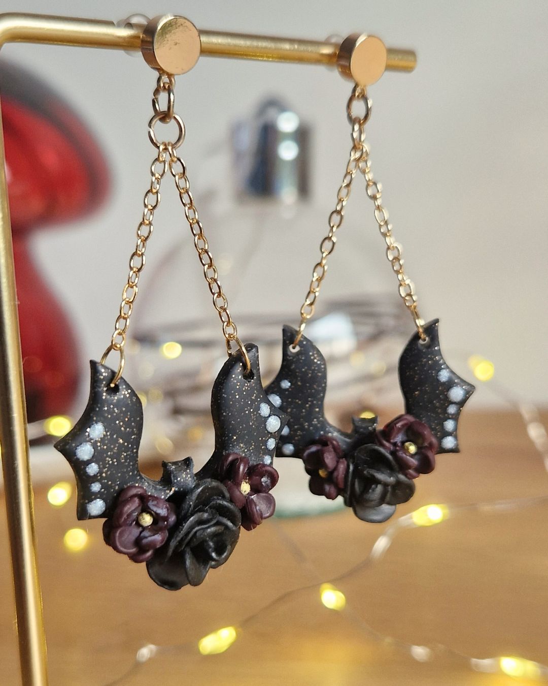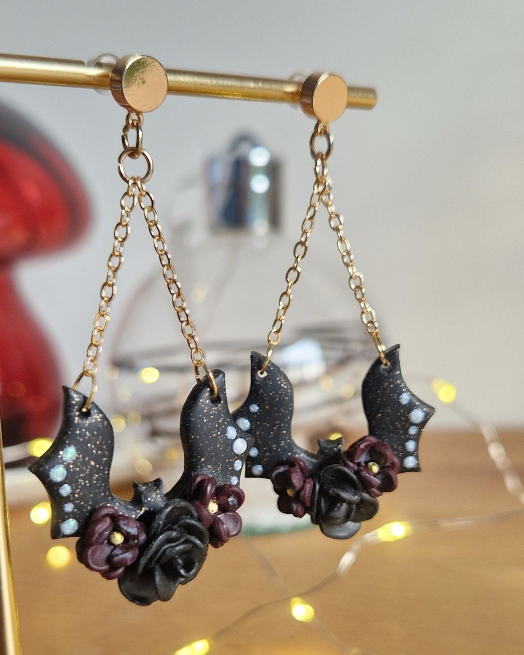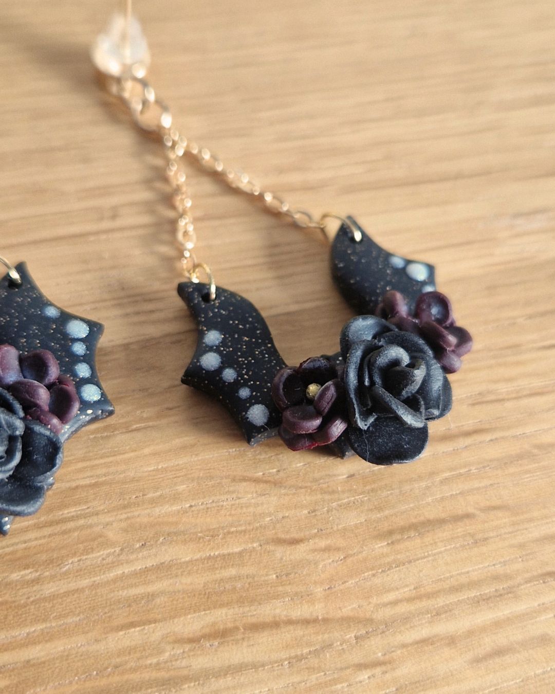 Ces boucles d’oreilles pendantes mêlent l’éclat profond du noir pailleté à la délicatesse de petites fleurs sculptées en relief, dans des tons prune envoûtants. Les chauves-souris, légères, dansent au bout de chaînettes dorées pour un mouvement subtil et magique.