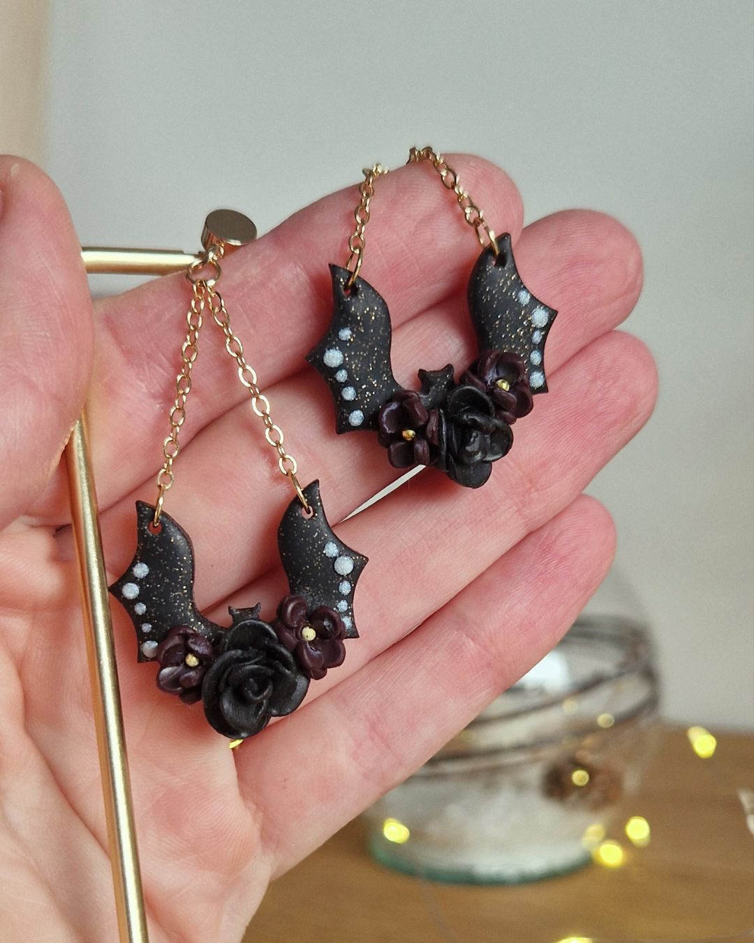Une création artisanale authentique : chaque chauve-souris et chaque fleur est modelée à la main.