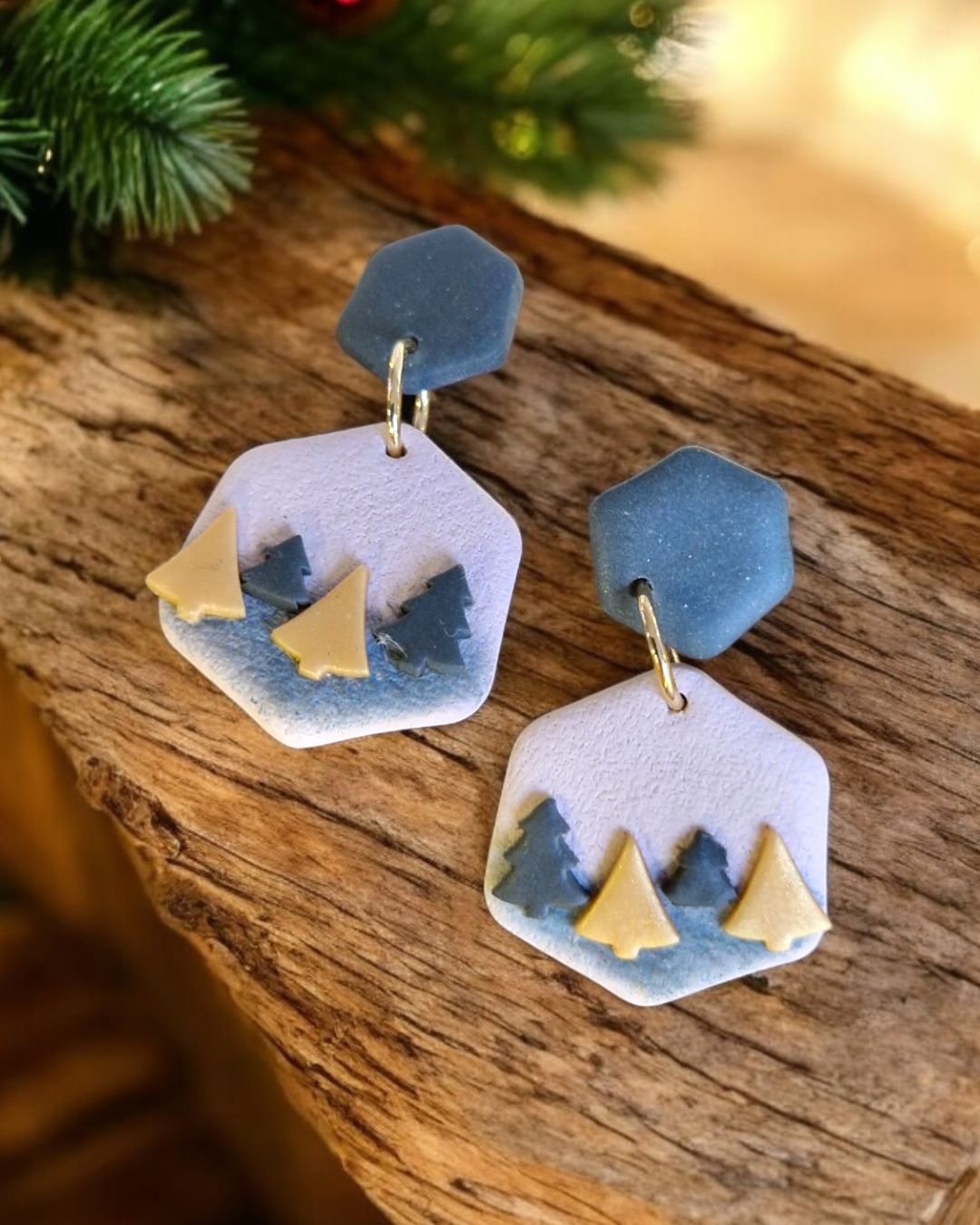 Ces boucles d’oreilles évoquent le reconfort d’une promenade hivernale : des sapins dorés et vert se dessinent en relief sur un fond beige texturé. Une création douce, poétique et chaleureuse, parfaite pour accompagner la saison froide ou simplement nourrir ton amour des ambiances de nature & magie.