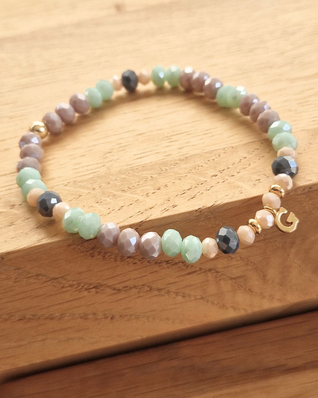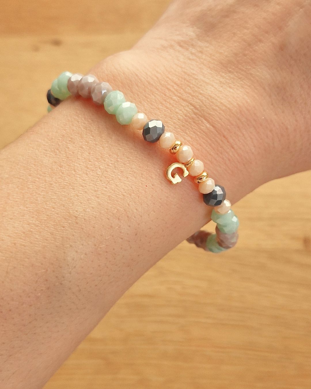 Le bracelet Rêverie délicate se décline ici avec une lettre plaquée or, pour une touche plus précieuse et éclatante. Les perles facettées, aux nuances pastel soigneusement choisies – vert d’eau, bleu doux, ivoire rosé et lilas – captent la lumière et apportent finesse et élégance au poignet.